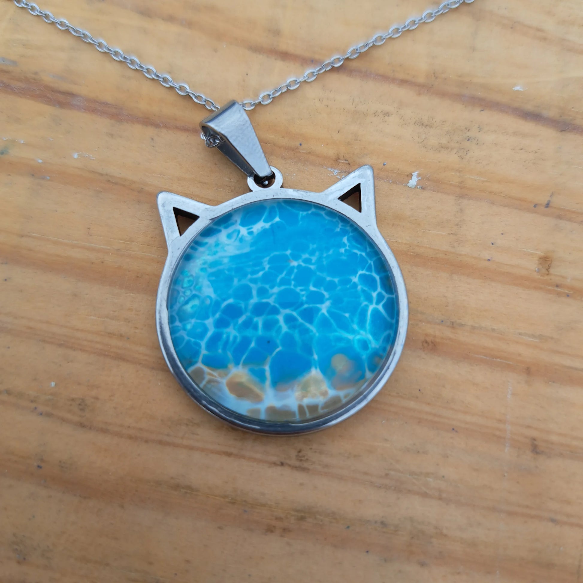 Crafted from durable 304 grade stainless steel, this cat pendant captures the calming essence of turquoise blue waters meeting a sandy brown shoreline. Measuring 1 1/8" high by 1" wide, it hangs delicately from a 17-inch stainless steel chain, offering both elegance and longevity.
